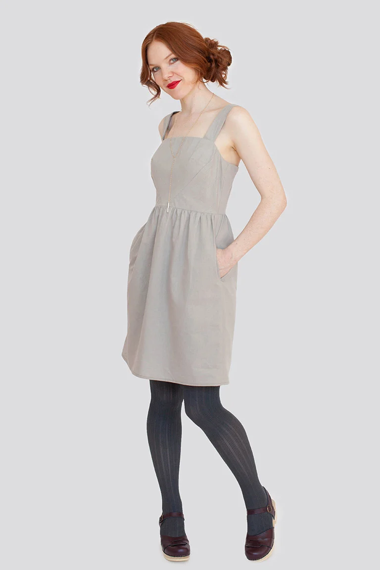 The Smith Pinafore dress is a low waste pattern; the pattern pieces form rectangles which can be cut to leave convenient-sized pieces for other projects. The clean, utilitarian lines hide excellent pockets in the front seams, which are also the pinafore's closure.